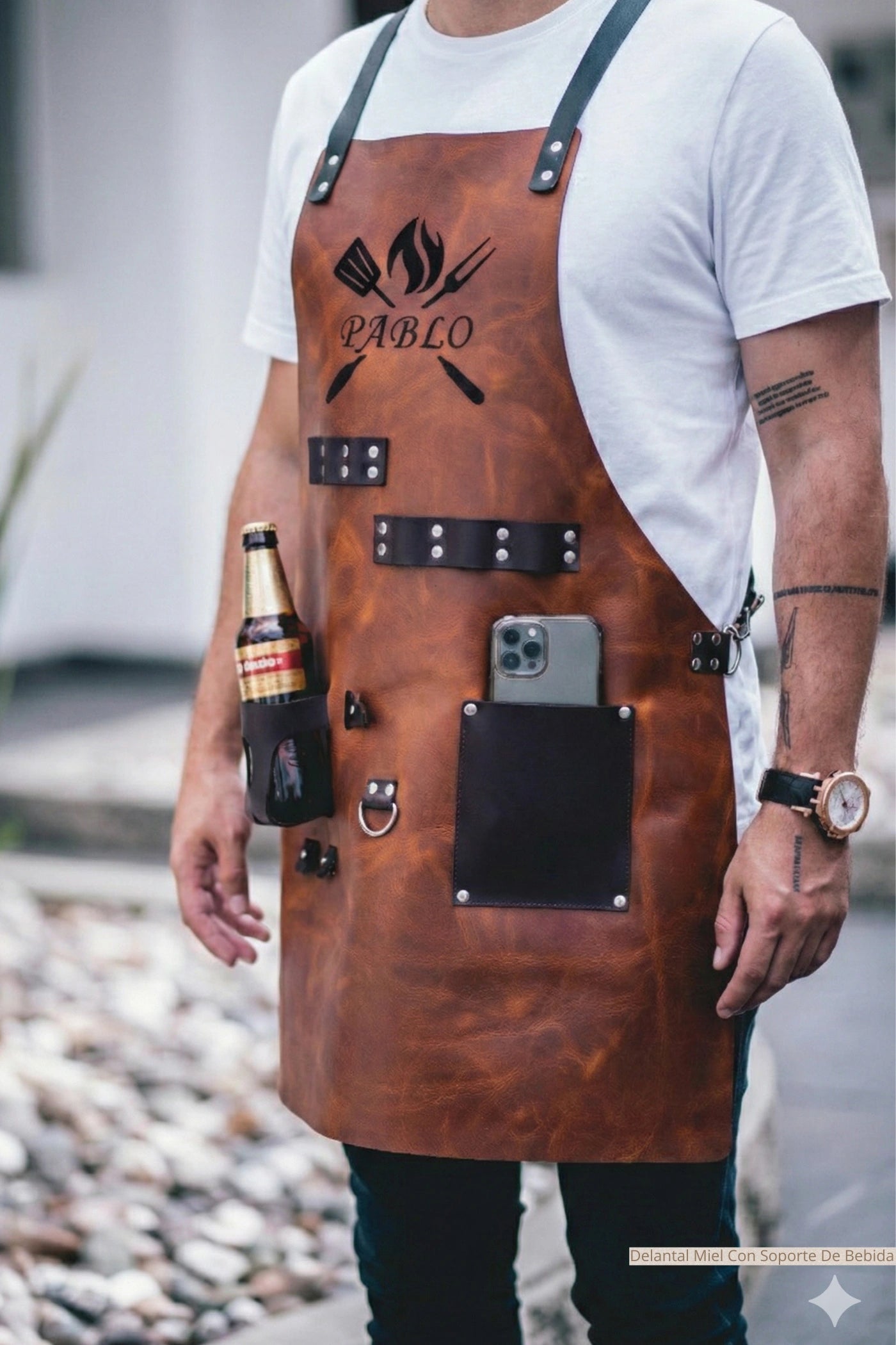 Diseñado minuciosamente, cuenta con soporte para bebida, bolsillos y correas ajustables que facilitan el trabajo en parrilla, cocina y otras actividades. Su acabado resistente protege de salpicaduras y altas temperaturas, mientras que su diseño exclusivo aporta un toque profesional y sofisticado.